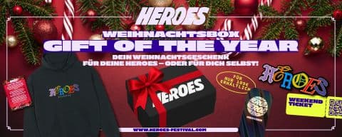 Die Heroes Weihnachtsbox ist eine limitierte Special Edition und beinhaltet ein vollständiges Festivalpaket für das Heroes Festival Geiselwind 2026.